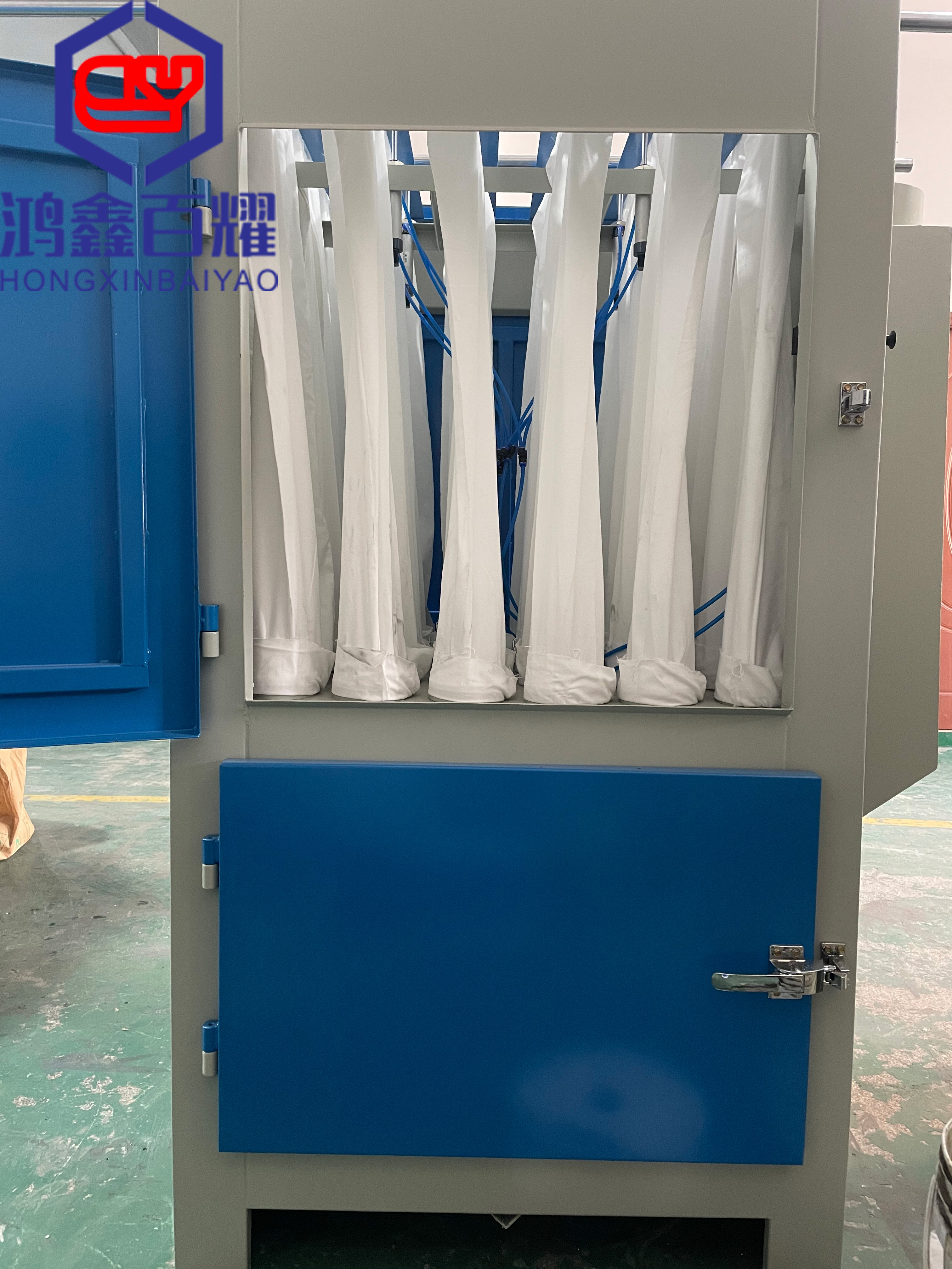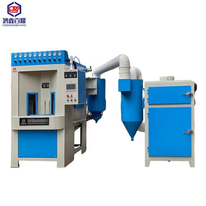 2.工作流程:先由人工或自动上料,将工件装载至转盘夹具,关闭舱门后系统自检并启动。转盘旋转至喷砂工位,多喷枪同时喷射,按设定时间旋转确保各面均匀受砂。喷砂结束后,转盘回初始位,除尘系统延时运行,之后开舱门卸料,流程自动重复。