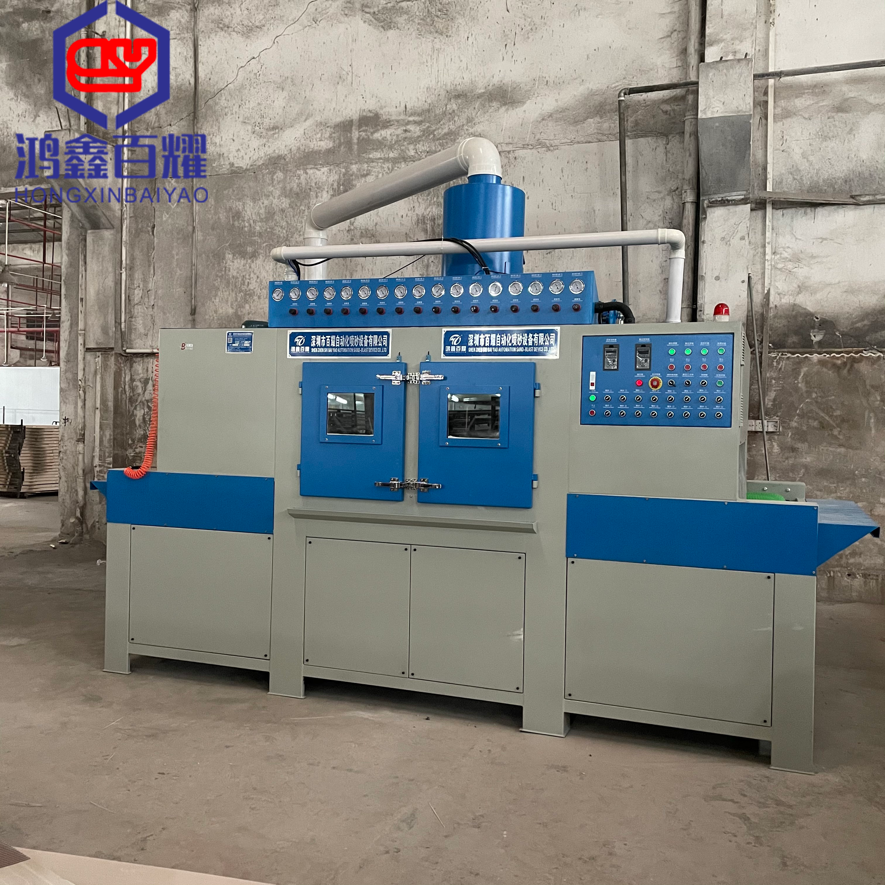1. 核心结构与工作逻辑:核心由双仓喷砂罐、工件输送组件、供气组件、砂料循环组件和除尘组件构成。双仓中,上仓负责储砂和补砂,下仓专职向喷枪供砂,配合料位传感器与密封阀,下仓砂量不足时上仓可自动补砂;供气组件分主、副单元,主单元给双仓供气保障喷砂气压,副单元驱动密封阀开闭,避免低压时密封失效。工件由皮带或辊道输送组件匀速送进喷砂室,喷枪喷射砂料处理后,残砂经循环组件回收筛分,再送回上仓循环使用,除尘组件同步处理粉尘防止外泄。