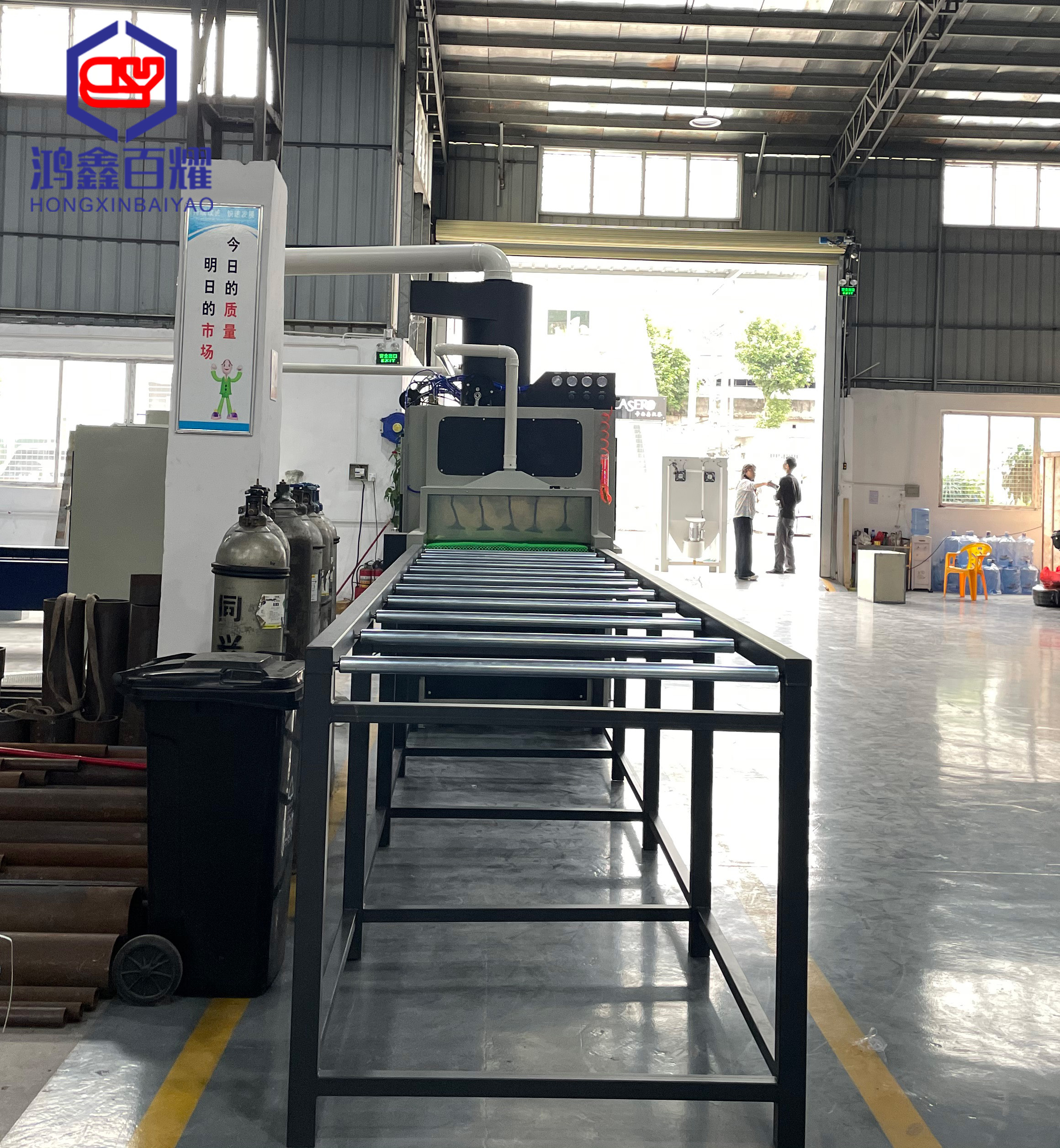 2. 关键参数:支架加长长度可定制,常规可延伸至8 - 20米,适配长度不限的长条工件;输送速度0.5 - 2m/min可变频调节;喷枪数量常见8 - 12支,喷嘴用耐磨碳化硼材质;整机总功率约5 - 10KW,喷砂压力5 - 8bar,除尘效率普遍≥99%,符合工业环保标准。