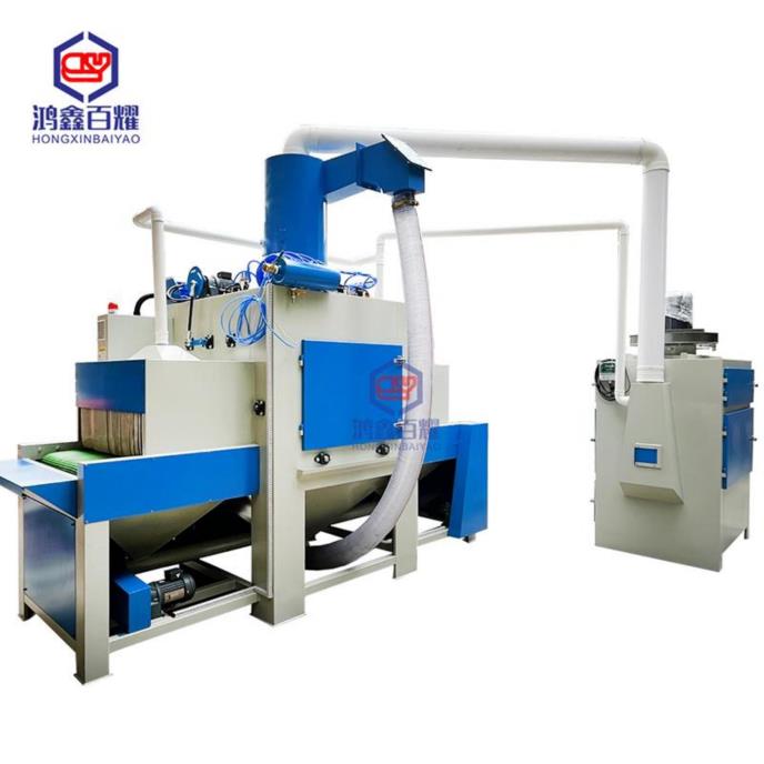 2. 工作流程:工件经输送系统匀速进入喷砂舱→PLC控制喷枪组(360°可调角度+自动摆动)喷射磨料→磨料冲击工件表面去除锈蚀/焊渣/毛刺→处理后工件随输送系统连续输出→残砂经回收系统分离复用→粉尘被除尘设备捕集,全程无需人工干预。
