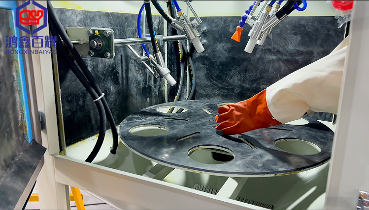 4. 硬核耐用性,降低长期成本舱体用耐磨橡胶内衬,喷枪配碳化硼喷嘴,寿命比普通喷嘴长 5 倍;转盘承重稳定,连续作业也不晃。一次投入就能长期稳定产出,人工成本省了,次品率也降了,性价比直接拉满
